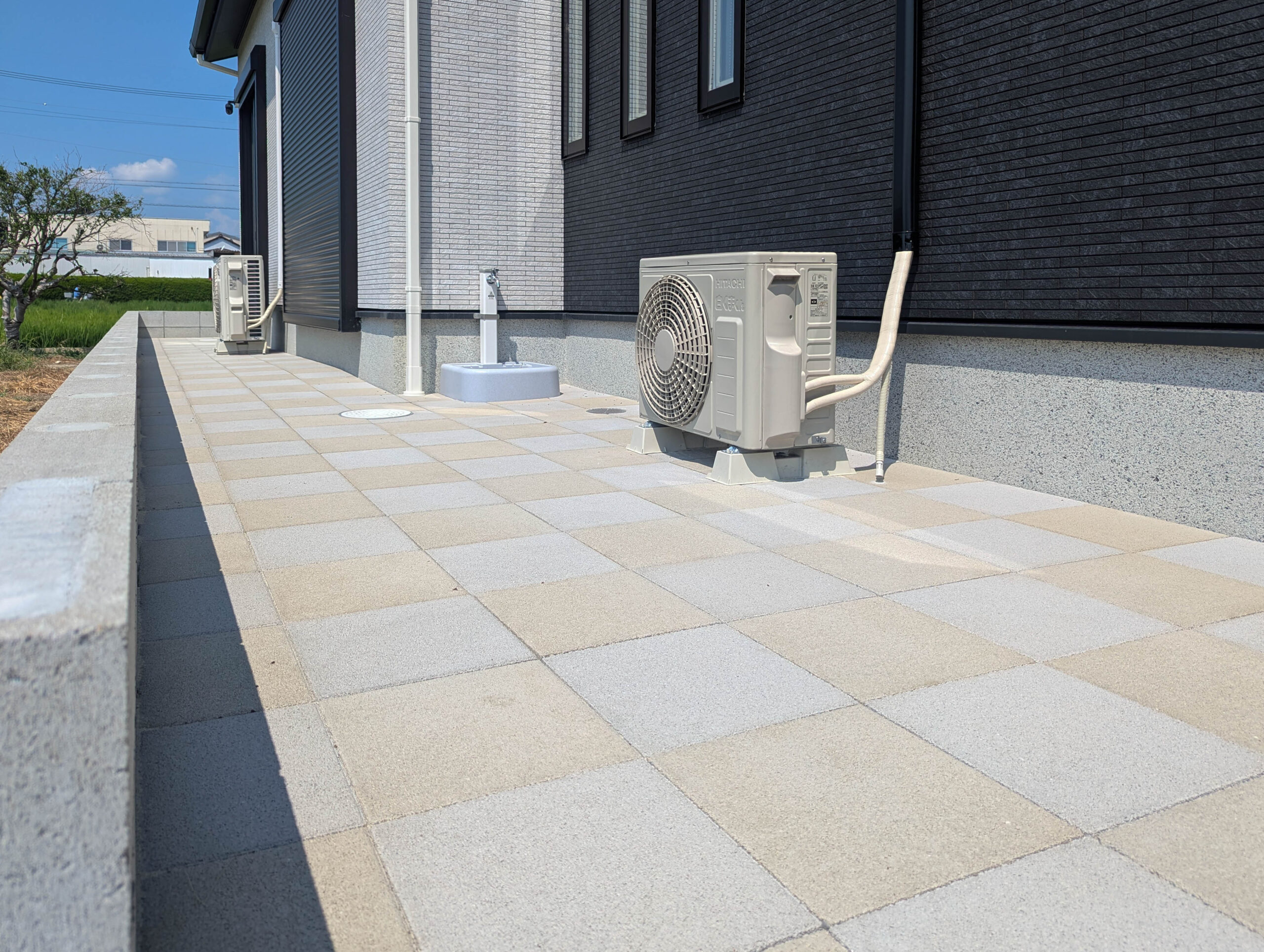 ●建物南側は敷地がブロックで囲まれているため、雨水が流れるように透水機能の高いコンクリート平板を施工しました。