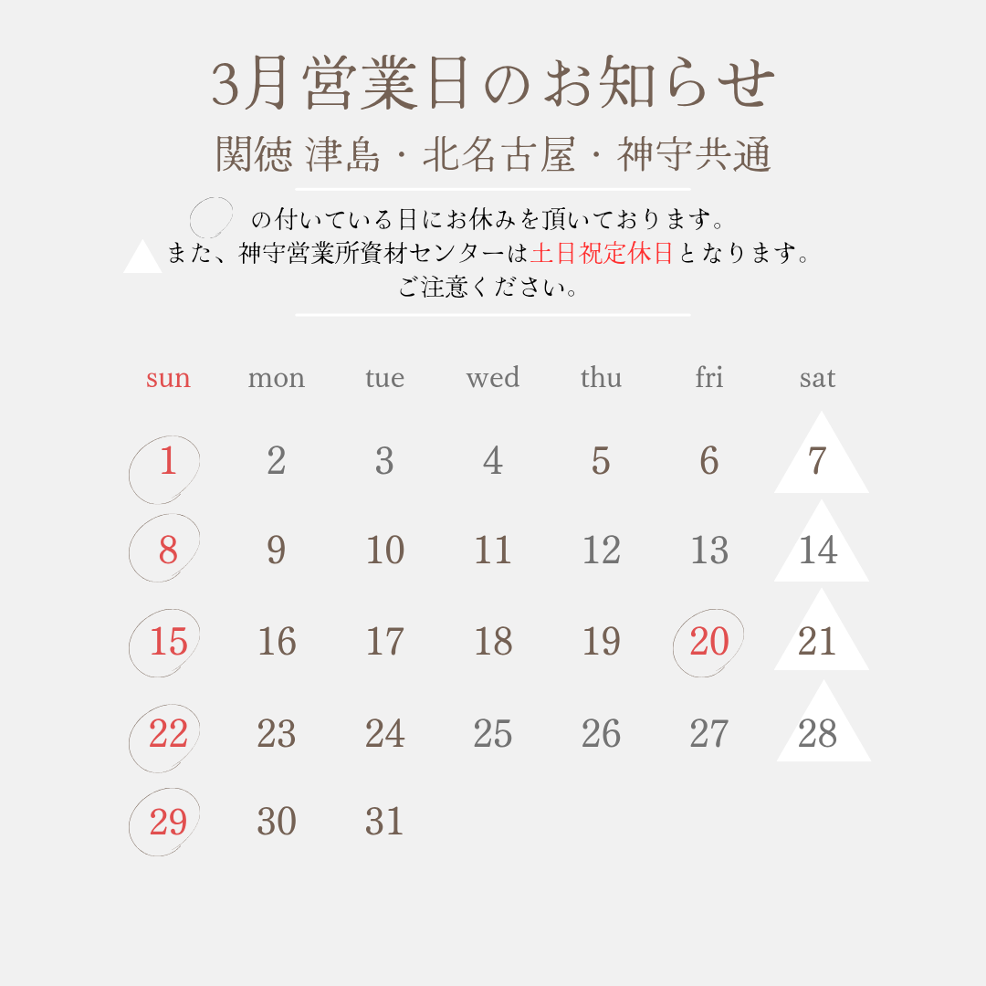 3月の営業日のお知らせです。