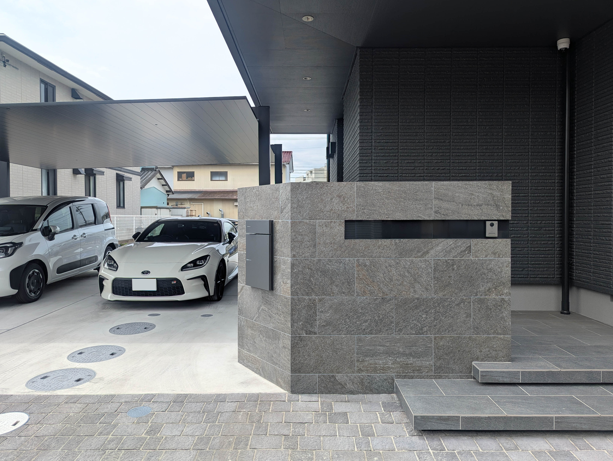門壁を斜めにすることで車の出入りがスムーズになり、さらにその部分に設置したポストは雨に濡れずに配達物を取り出せます。