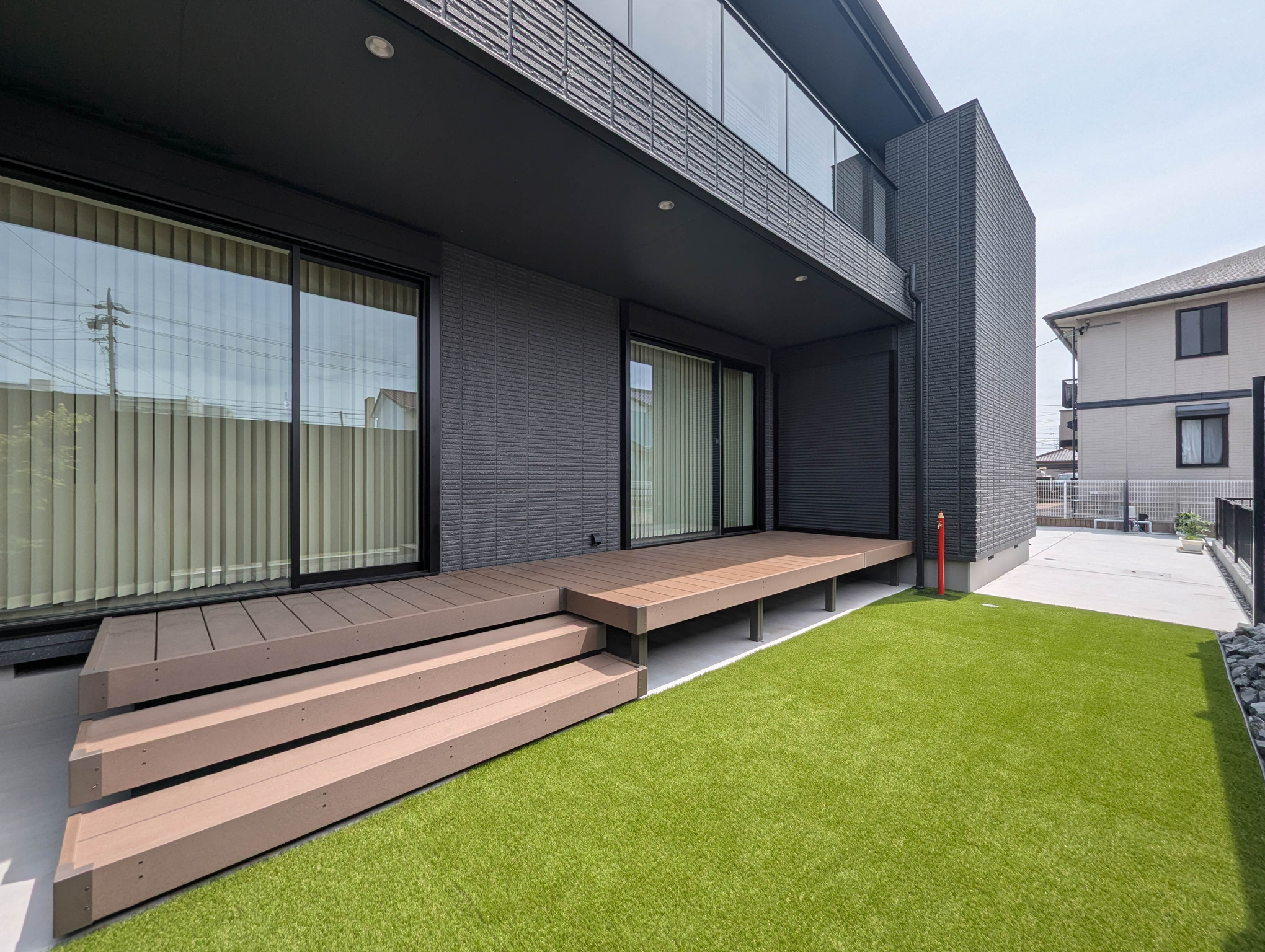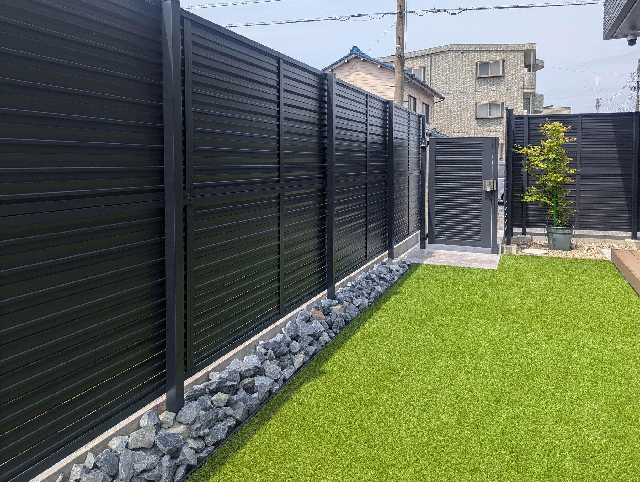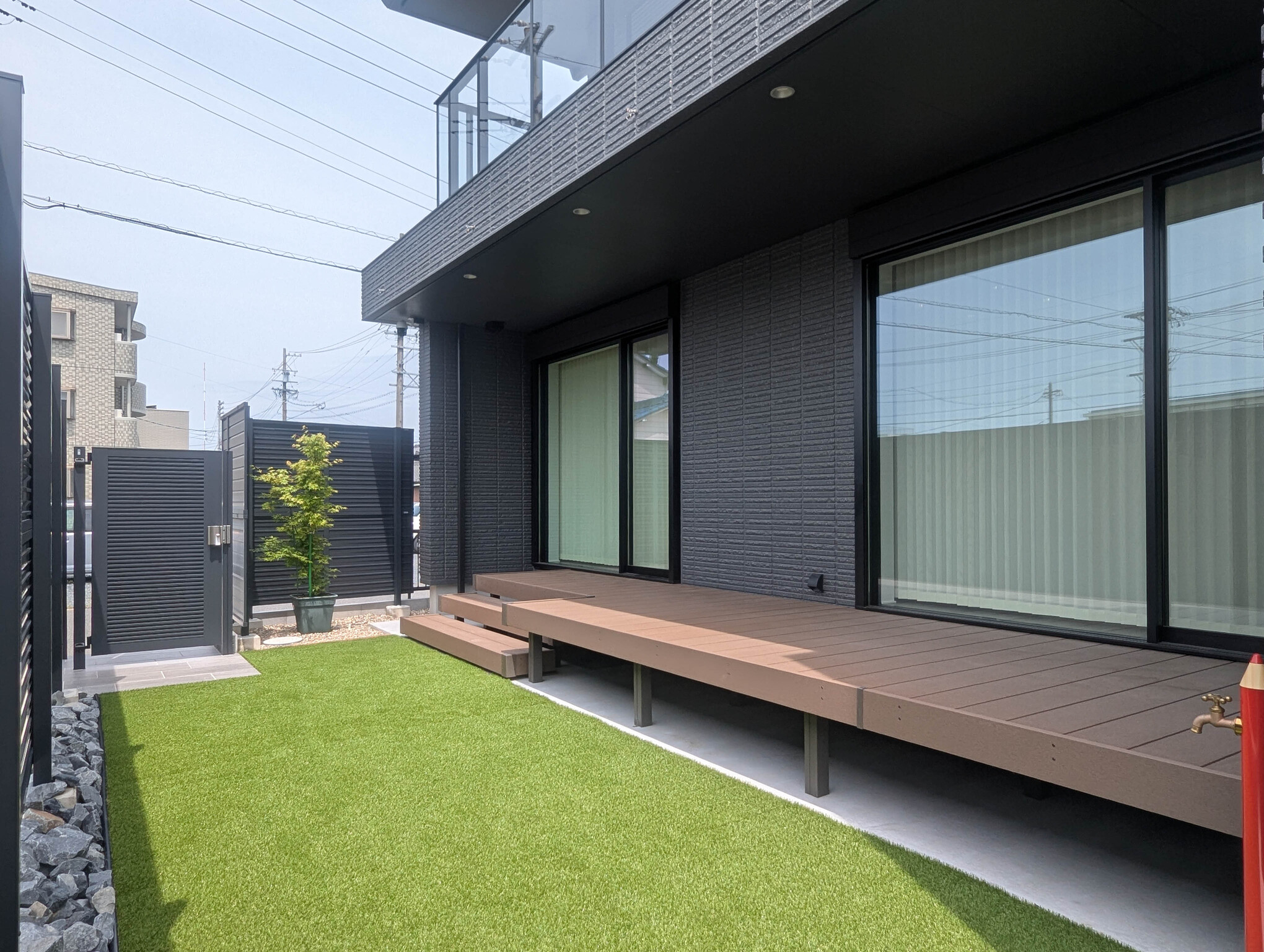 建物の向かい側が道路のため、目隠しフェンスを2メートルにすることでプライベート空間をしっかり守りました。