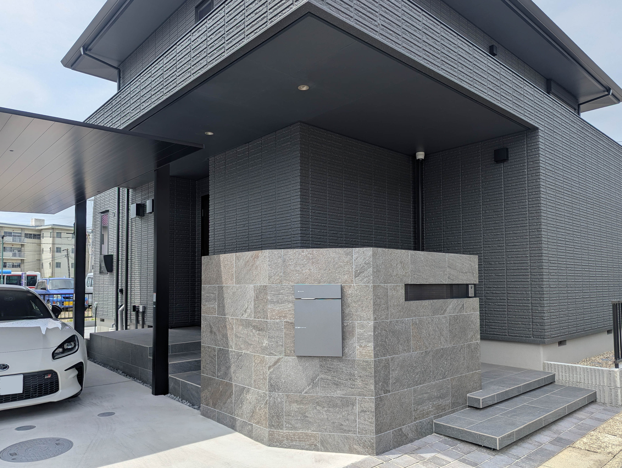斜めの部分にポスト兼宅配ボックスを設置することで見た目をすっきりさせました。