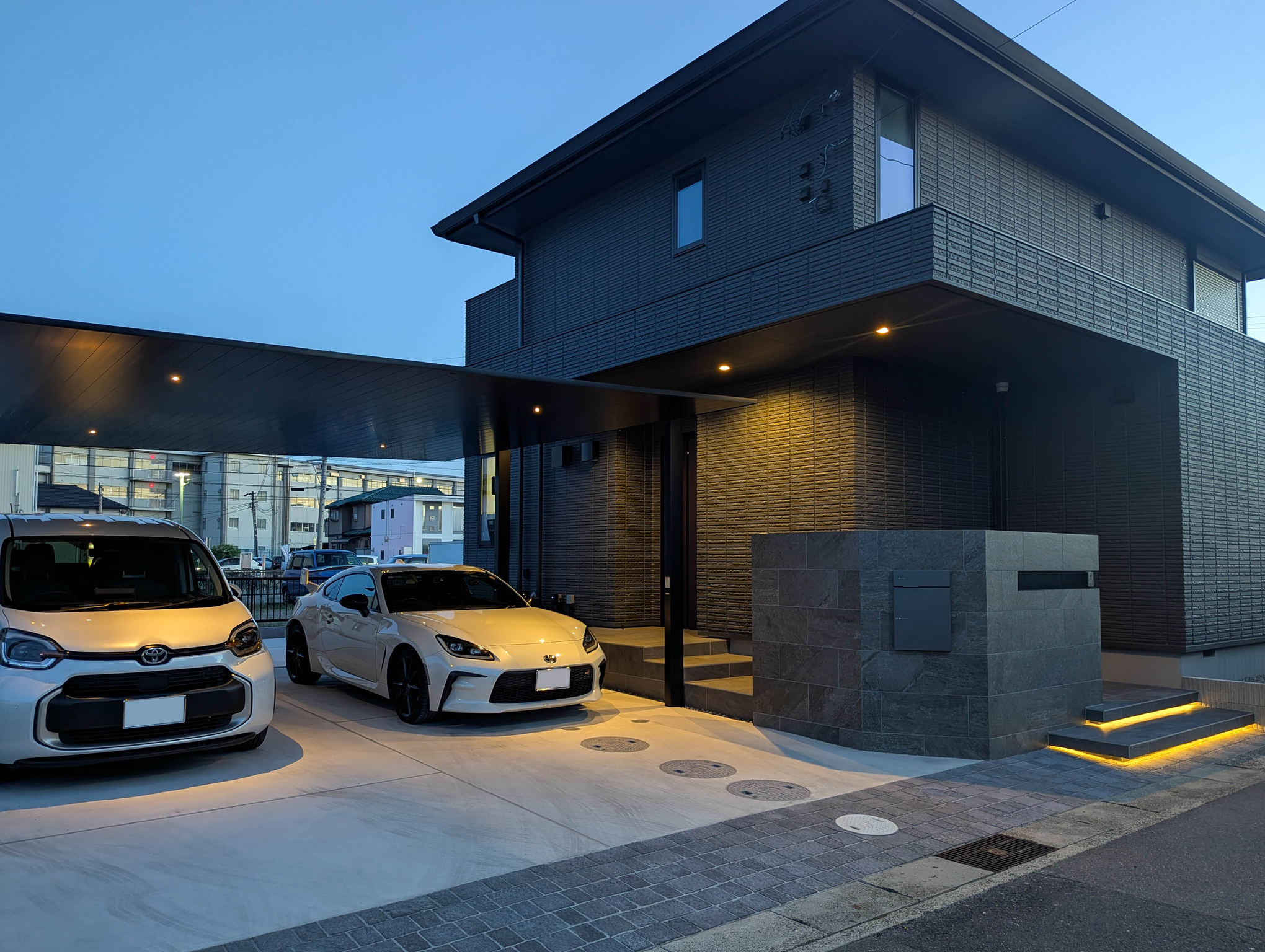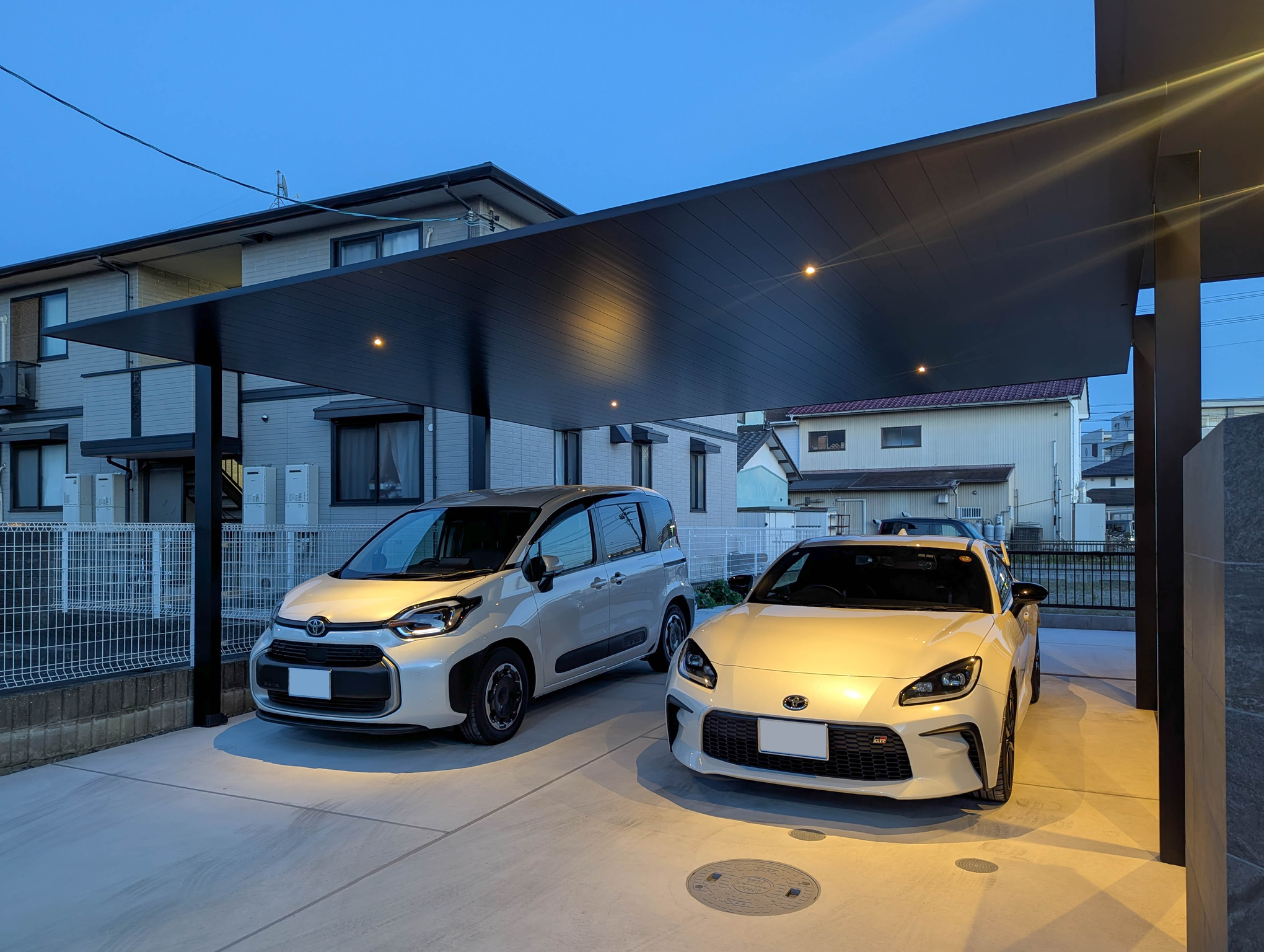 カーポートにはダウンライトをつけ、愛車を明るく照らし、安全性と機能性を高めます。